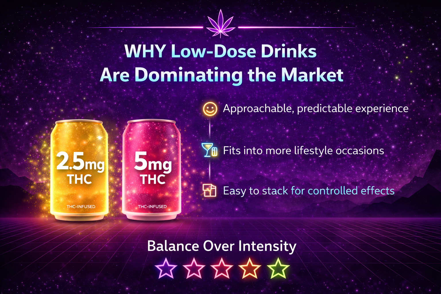 Low-dose THC drinks, typically in the 2.5mg to 5mg range, are leading the charge. They’re approachable, predictable, and easy to stack if needed. Instead of committing to a strong experience, you can build it gradually.